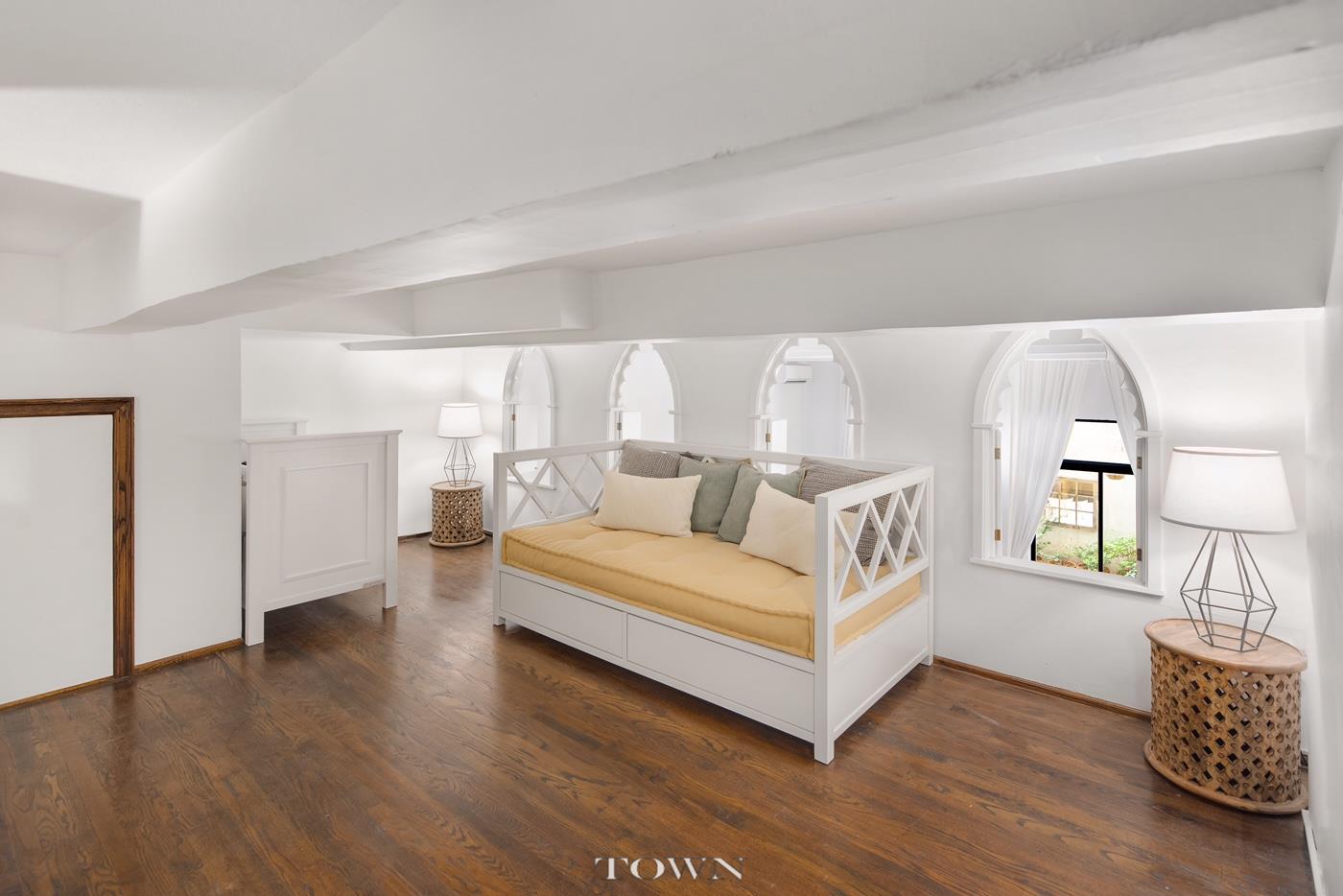 The tranquil bedroom suite features more sky-high beamed ceilings and another glass door to the patio. A massive walk-in California closet effortlessly attends to wardrobe needs while the brand-new, spa-like bathroom spoils with white Carrara marble heated floors, a Kohler Tea-for-Two deep soaking tub and separate glass shower, oversized dual-sink vanity and Robern medicine cabinet with GFI integrated outlets. Upstairs, a sprawling loft space, with distinctive arches that peek into the vast great room below, is ideal as a home office, guest suite or second bedroom.